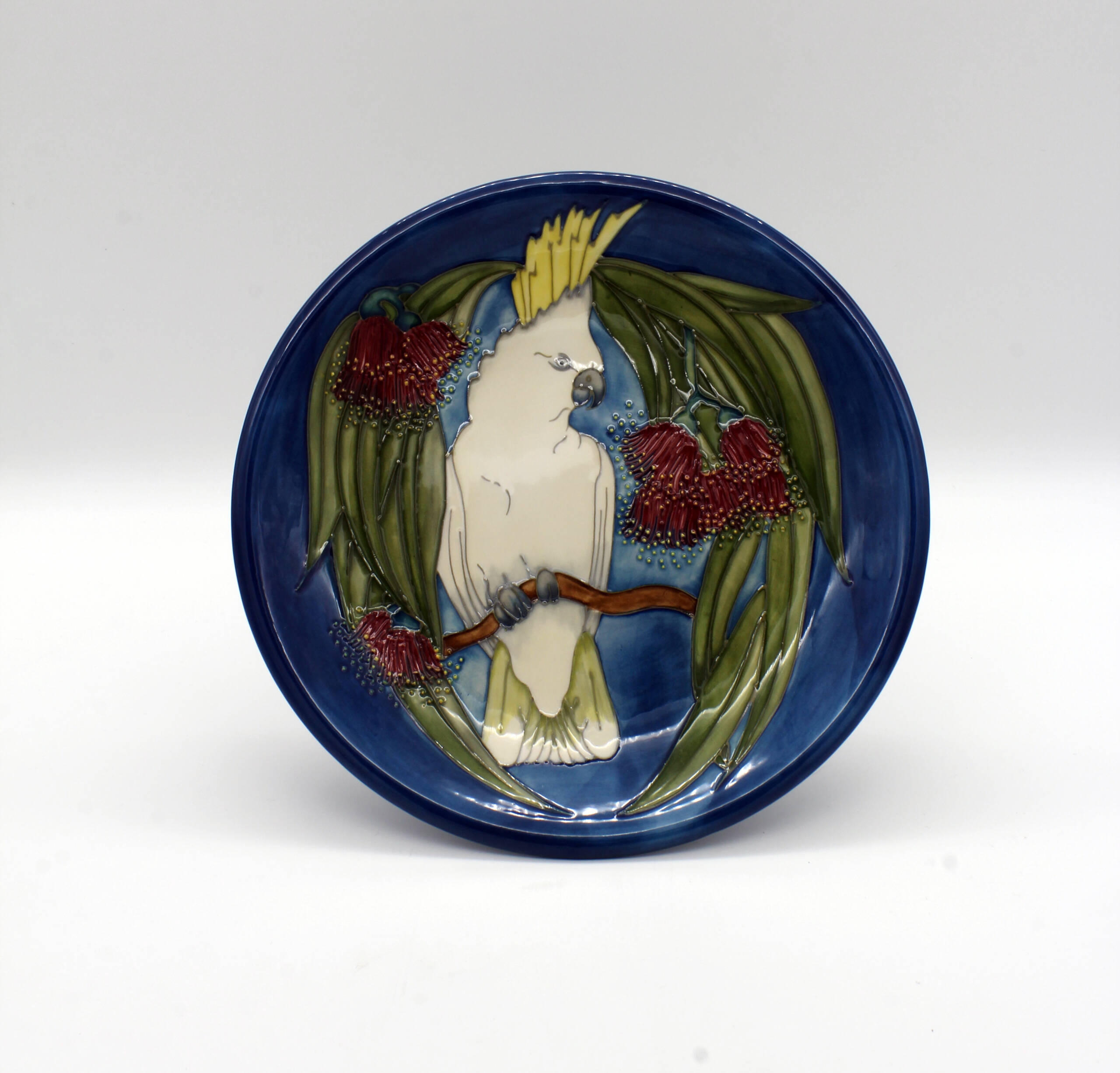 The sulphur-crested cockatoo is a large white parrot with a dark grey bill and a distinctive yellow crest. They exist throughout the northern and eastern mainland and Tasmania and their normal diet consists of berries, seeds, nuts and roots. Rachel’s design sees this glorious bird draped by the red flowering gum’s striking flowers and leaves on a rich blue ground. This was the first Australian commission.