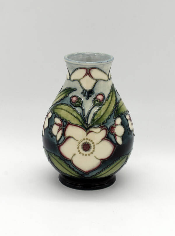 The York rose is white in colour, because in Christian liturgical symbolism, white is the symbol of light, typifying innocence and purity, joy and glory. A white heraldic rose is the symbol of the house of York and has since been adopted as a symbol of Yorkshire as a whole. The colours in Rachel’s vase, mirror the colours of the Yorkshire Flag. Signed and dated in gold pen over glaze by John Moorcroft.